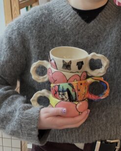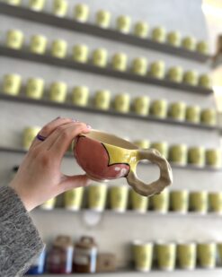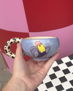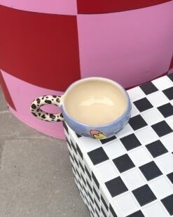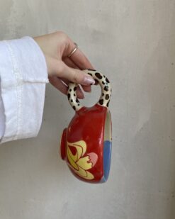 This exceptional mug is not only fascinating in its shape, but also in its bold colour scheme. Bold tones of red, yellow and black, combined with natural brushstrokes, create a playful yet stylish composition. The organic shape, the slightly irregular silhouette and the distinctive design of the leopard-print handle make this mug a contemporary art object, both functional and decorative. It fits perfectly in both modern and eclectic interiors.