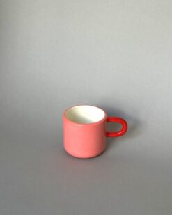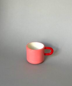 - Solid pink mug with a red handle, reflecting a contemporary color combination and adding light and energy.