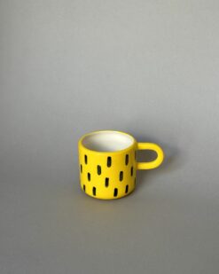 - Bright yellow tea mug with black spots, reminiscent of leopard print, will add an exotic and bold accent to your kitchen.