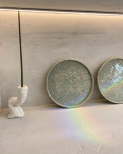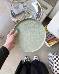 This green and white ceramic plate is a unique handmade piece that will not only enrich your dining experience, but will also become a stylish piece of home decor. Each plate is designed with the utmost attention to detail, and its marbled patterns and sweet tones make it unique.
