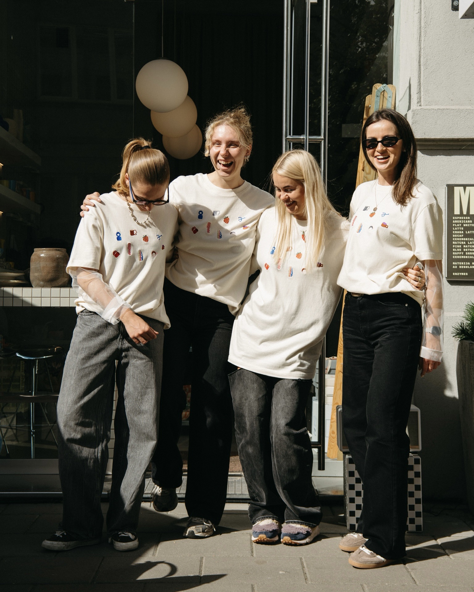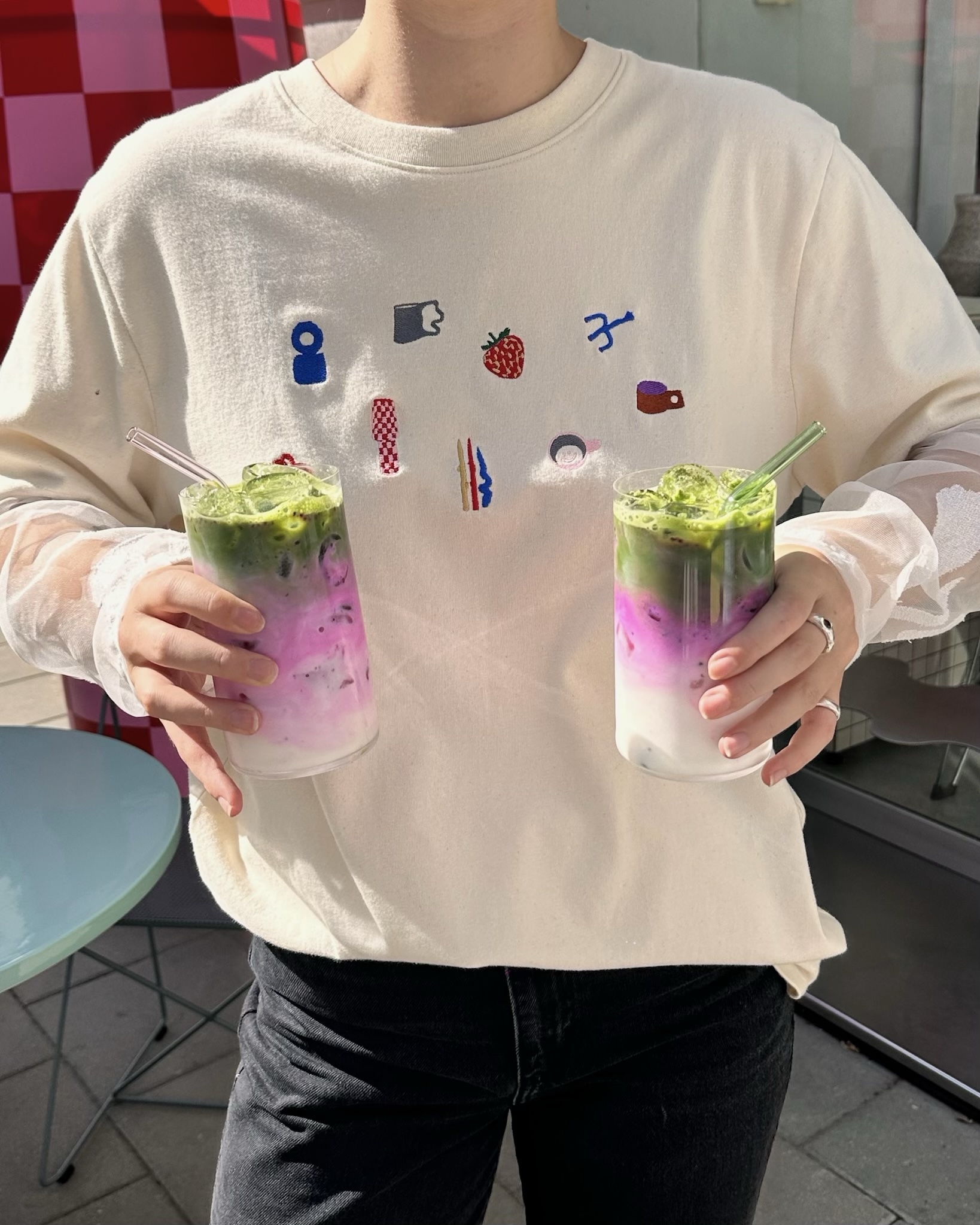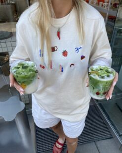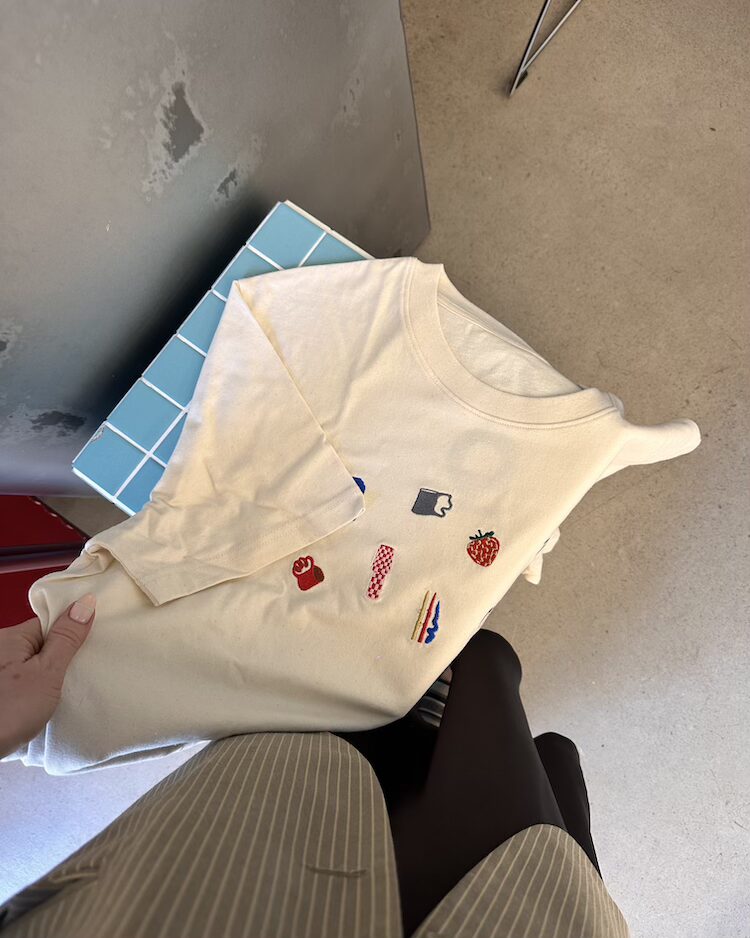 • embroidered MENO MATERIJA objects on the front