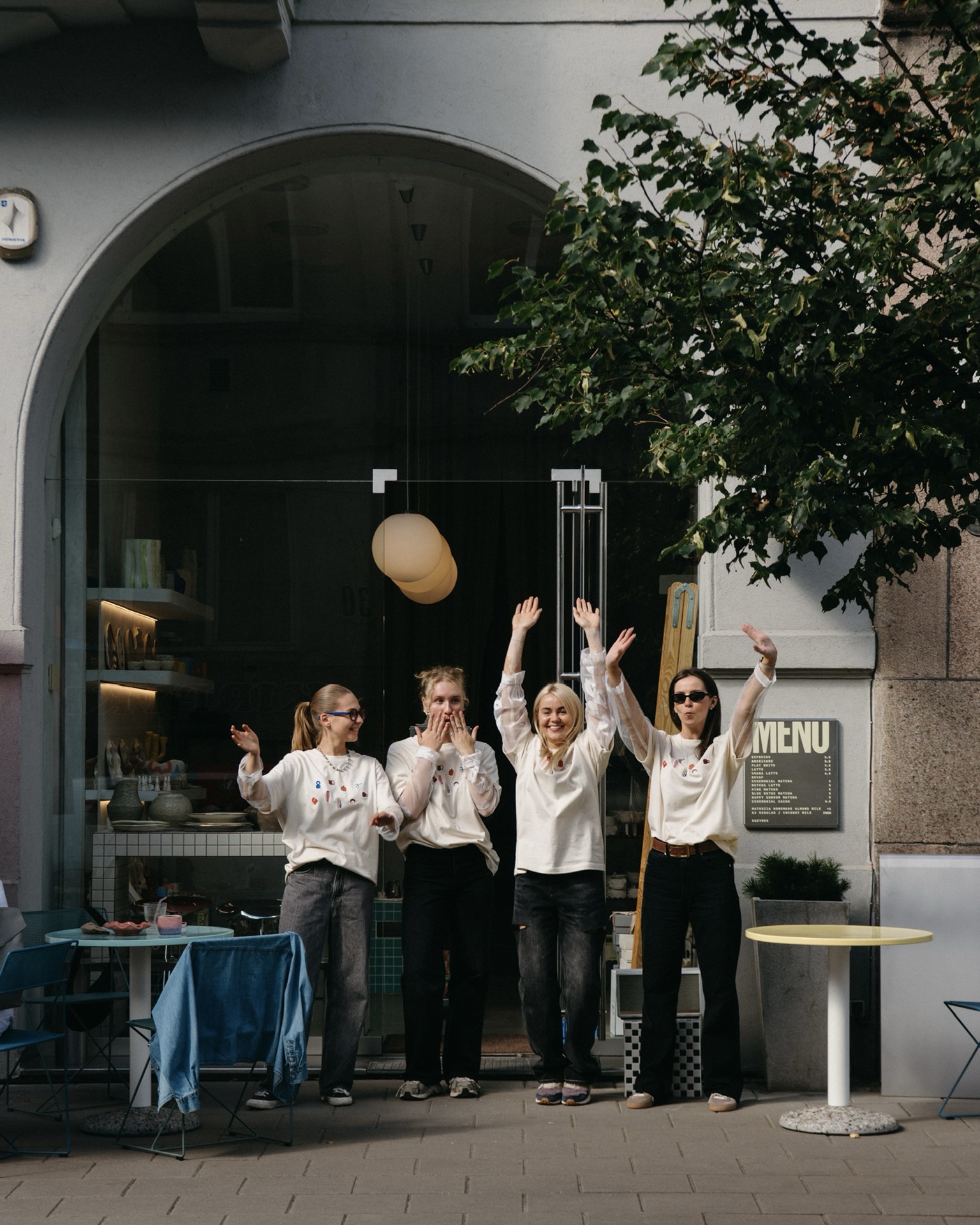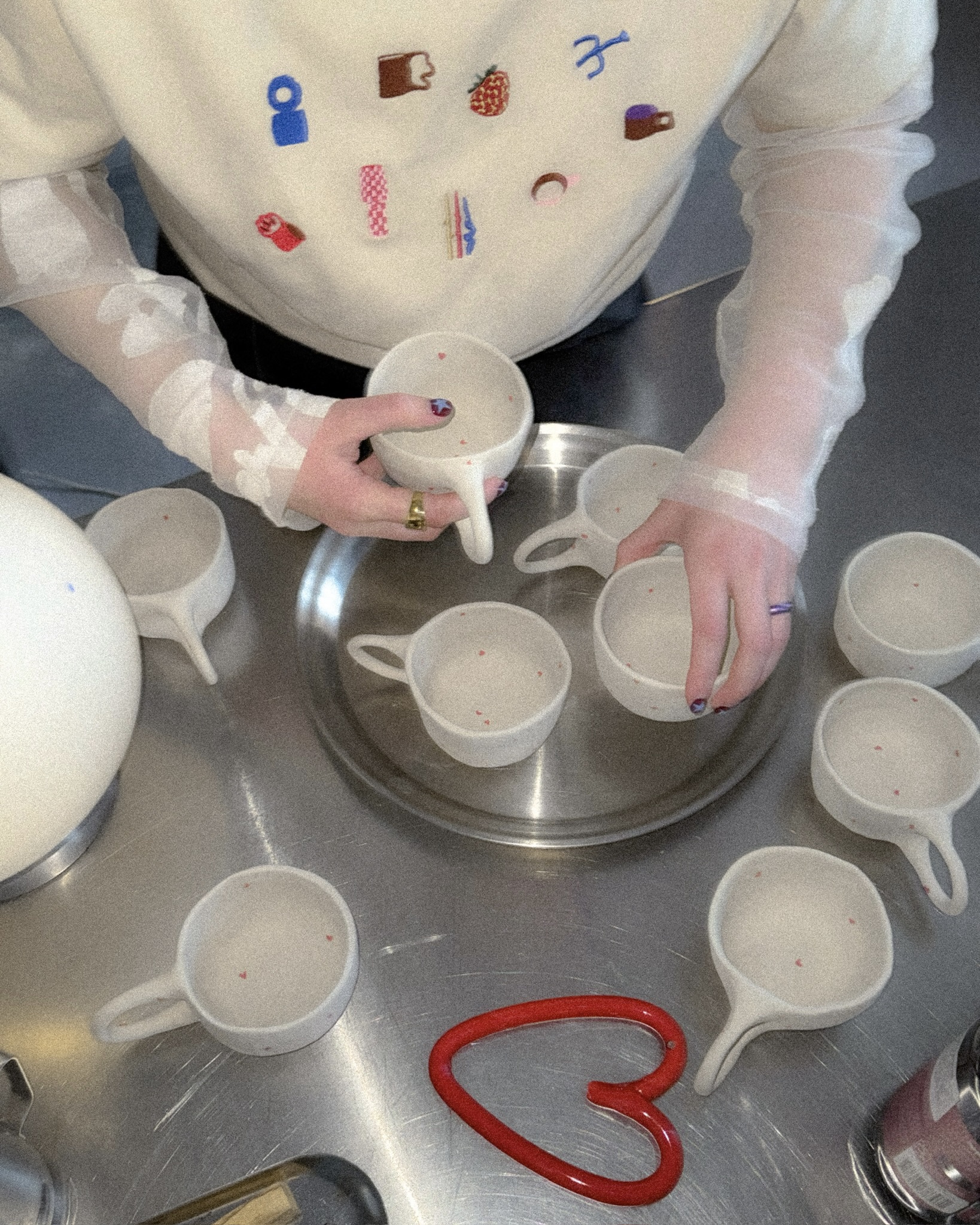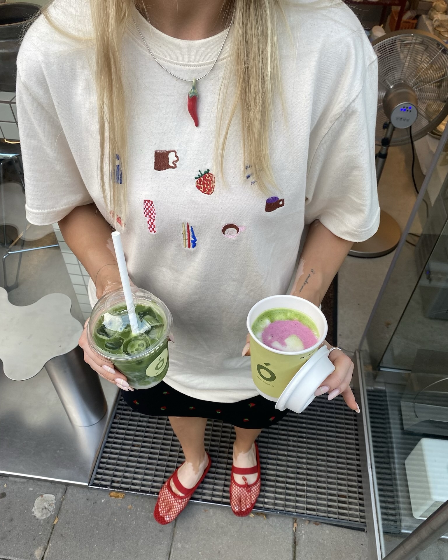 • embroidered MENO MATERIJA objects on the front