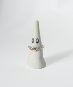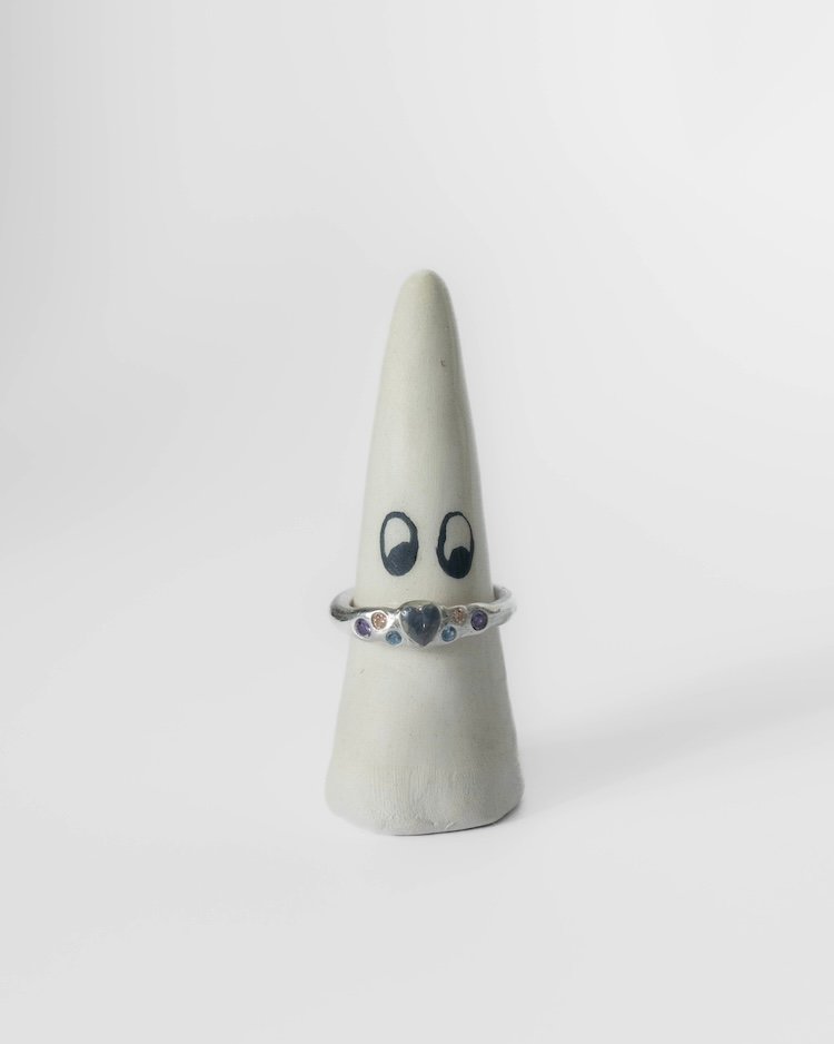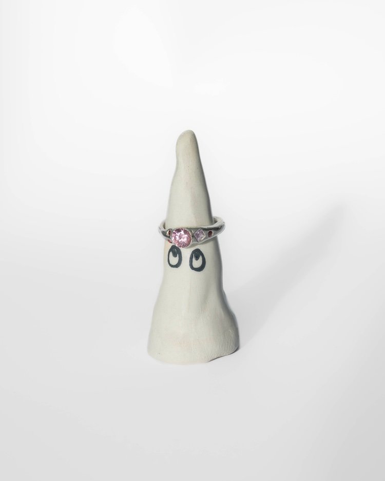 Prie kiekvieno žiedo pridedame ir žiedo stovelį vaiduokliuką. Tai minimalistinė, žaisminga atrama, leidžianti žiedui ne tik būti dėvimu, bet ir puošti erdvę kaip mažam meno objektui. Ant stovelio žiedas tampa tarsi ekspozicijos dalimi – jis gali stovėti jūsų namuose kaip priminimas apie unikalumą, kurį nešiojatės kartu.
