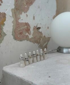 Prie kiekvieno žiedo pridedame ir žiedo stovelį vaiduokliuką. Tai minimalistinė, žaisminga atrama, leidžianti žiedui ne tik būti dėvimu, bet ir puošti erdvę kaip mažam meno objektui. Ant stovelio žiedas tampa tarsi ekspozicijos dalimi – jis gali stovėti jūsų namuose kaip priminimas apie unikalumą, kurį nešiojatės kartu.