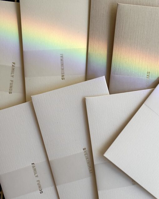 Meno Materijoje galite įsigyti įvairiausių spalvų dovanų vokų su užrašais „Sveikinimai“ arba „Family Funds“. Užrašas „Sveikinimai“ puikiai tinka bet kokiai progai, pavyzdžiui, gimtadieniui, mergvakariui ar jubiliejui. Tuo tarpu „Family Funds“ užrašas yra puikus pasirinkimas šeimos šventėms, pavyzdžiui, krikštynoms ar vestuvėms bei šeimos susibūrimams, kai norite parodyti savo paramą ir meilę artimiesiems.