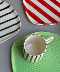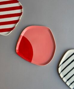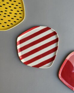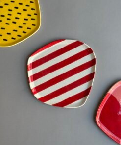 - Vintažinių saldainių pakuotes primenanti raudonais dryžiais dekoruota lėkštė, kuri nukels jus į praeities saldumynų pasaulį ir suteiks interjerui žavingo retro stiliaus.