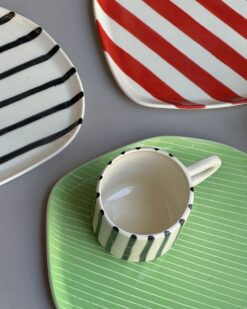 - Žaliai dryžuota lėkštė, primenanti pievų laukus, sukurs jaukią ir gamtos įkvėptą atmosferą.