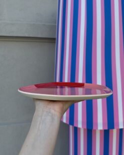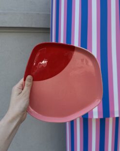 - Vienspalvė rožinė lėkštė su raudonu krašteliu, atspindinti šiuolaikišką spalvų derinį ir pridėsianti šviesos bei energijos.