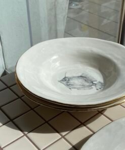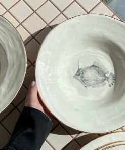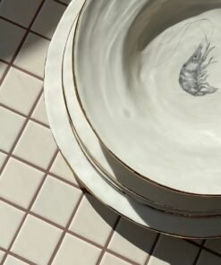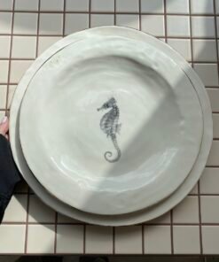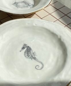 Viduje esantys piešiniai – ranka piešti jūrų gyvūnai: krevetės, jūrų arkliukai, žuvys. Jie nespalvoti, atlikti pieštuko technika, tad atrodo tarsi iš senų gamtos iliustracijų knygų. Kiekvienas piešinys unikalus ir pasakoja savitą istoriją, todėl šios lėkštės tampa ne tik funkcionaliu, bet ir dekoratyviniu akcentu jūsų namuose.