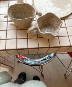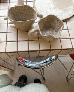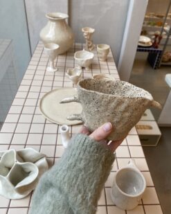 Kitas puodelis išsiskiria tuo, kad vietoj įprastos rankenėlės turi tris iškilusius spygliukus. Jie ne tik vizualiai intriguojantys, bet ir praktiški – už jų galima patogiai prilaikyti puodelį. Šis dizainas kelia asociacijas su laukinėmis gamtos formomis ar fantastinėmis būtybėmis.