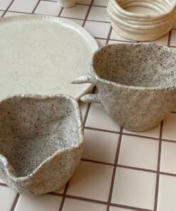 Šie du unikalūs rankų darbo puodeliai sukurti iš akmens masės keramikos – tai ne tik funkcionalūs indai, bet ir savotiški meno objektai. Jie pasižymi grubliu, šiek tiek šiurkščiu paviršiumi, kuris suteikia natūralumo pojūtį ir sustiprina ryšį su žeme. Toks paviršius ne tik estetiškas, bet ir maloniai jaučiamas rankose.