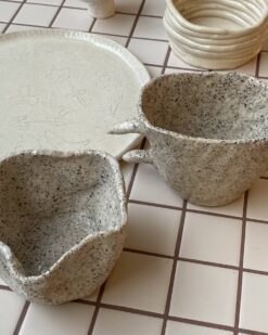 Vienas iš puodelių pasižymi švelniai banguota forma ir turi rankenėlę – jis tarsi įkūnija vandens tekėjimą ar molio judėjimą tarp pirštų. Jo siluetas organiškas, ne taisyklingas, tačiau itin gyvas – kiekvienas kampas primena meistriškai išjaustą formą.