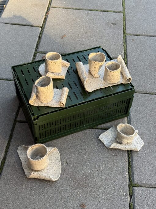 Šie espresso puodeliai su lėkšte išsiskiria minimalistine, tačiau giliai organiška estetika. Akmens masės keramika suteikia jiems natūralų tvirtumą, o subtilus paviršiaus reljefas primena žemės faktūrą po lietaus. Tai puodeliai, kurie kviečia sustoti akimirkai – pajusti molio šilumą, kavos aromatą ir tylų rytinį ritualą.