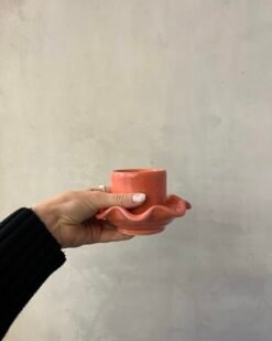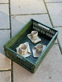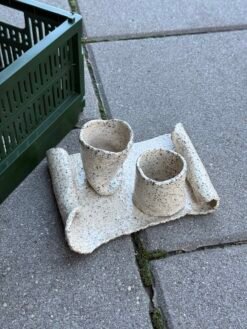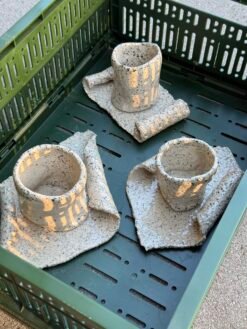 Šie espresso puodeliai su lėkšte išsiskiria minimalistine, tačiau giliai organiška estetika. Akmens masės keramika suteikia jiems natūralų tvirtumą, o subtilus paviršiaus reljefas primena žemės faktūrą po lietaus. Tai puodeliai, kurie kviečia sustoti akimirkai – pajusti molio šilumą, kavos aromatą ir tylų rytinį ritualą.