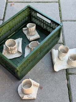GRAINSTONE espresso puodeliai su lėkštelėmis – tai mažos žemės ir ugnies istorijos, sugulusios į formą. Kiekvienas jų – unikalus rankų darbo kūrinys, kuriame dera žemiškas grublėtumas ir subtili elegancija.