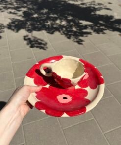 Vasara trykštantis keramikinis puodelis su lėkštute. Šie rankų darbo meno kūriniai yra vienetiniai ir unikalūs. Tai ne tik indas, bet ir gabalėlis meninės vertybės, kuriuo galima pasidžiaugti kasdien, geriant kavą ir skanaujant desertą.