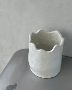 Cilindro formos vaza banguotais kraštais primena karūną ir kelia prabangos, išlavinto skonio jausmą. Grublėtas, nelygus paviršius byloja apie kruopštų menininkės rankų darbą ir autentiškumą. Tai vienetinis meno kūrinys, kuris yra unikalus ir nepakartojamas. Vazos paviršius padengtas šiek tiek blizgia glazūra, kuri suteikia šiuolaikiško žaismingumo.