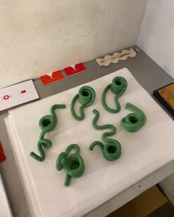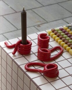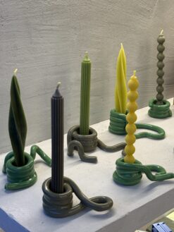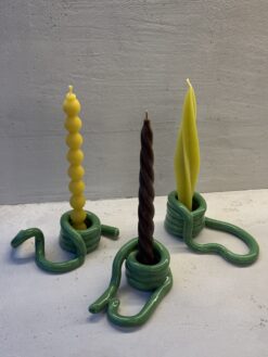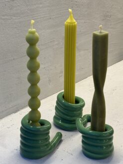 Šios žvakidės išsiskiria unikalia dizaino koncepcija. Jų spiralės, kilpos ir lenktos linijos primena abstrakčią skulptūrą, kurią galima pritaikyti pagal savo poreikius ar nuotaiką. Ryškios spalvos – sodri raudona, svajinga mėlyna, gili žalia, žaisminga geltona – sukuria kontrastingą efektą, todėl jos tinka tiek neutraliems, tiek ryškesniems namų interjerams. Glotnus paviršius ir kruopščiai nuglazūruotos detalės suteikia aukštos kokybės pojūtį, o rankų darbo metodas užtikrina kiekvieno gaminio unikalumą.
